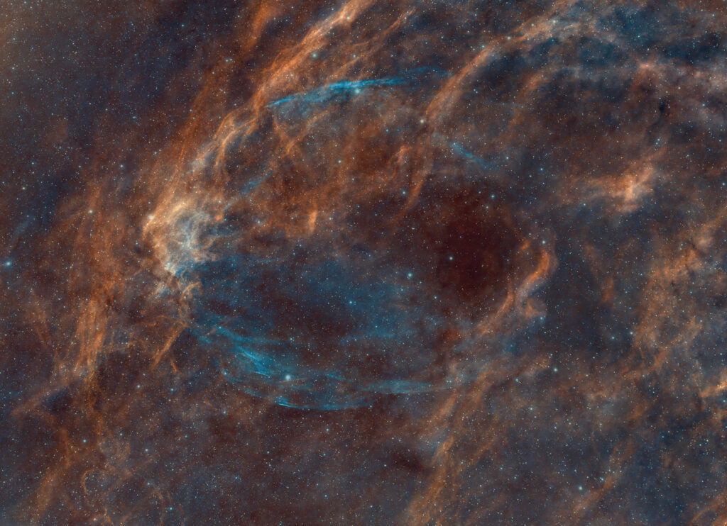 Also known as the Satellite Cluster, NGC 2244 appears in the centre of the Rosette. The hot young stars of the cluster were formed from the nebula’s material in the last 5 million years.